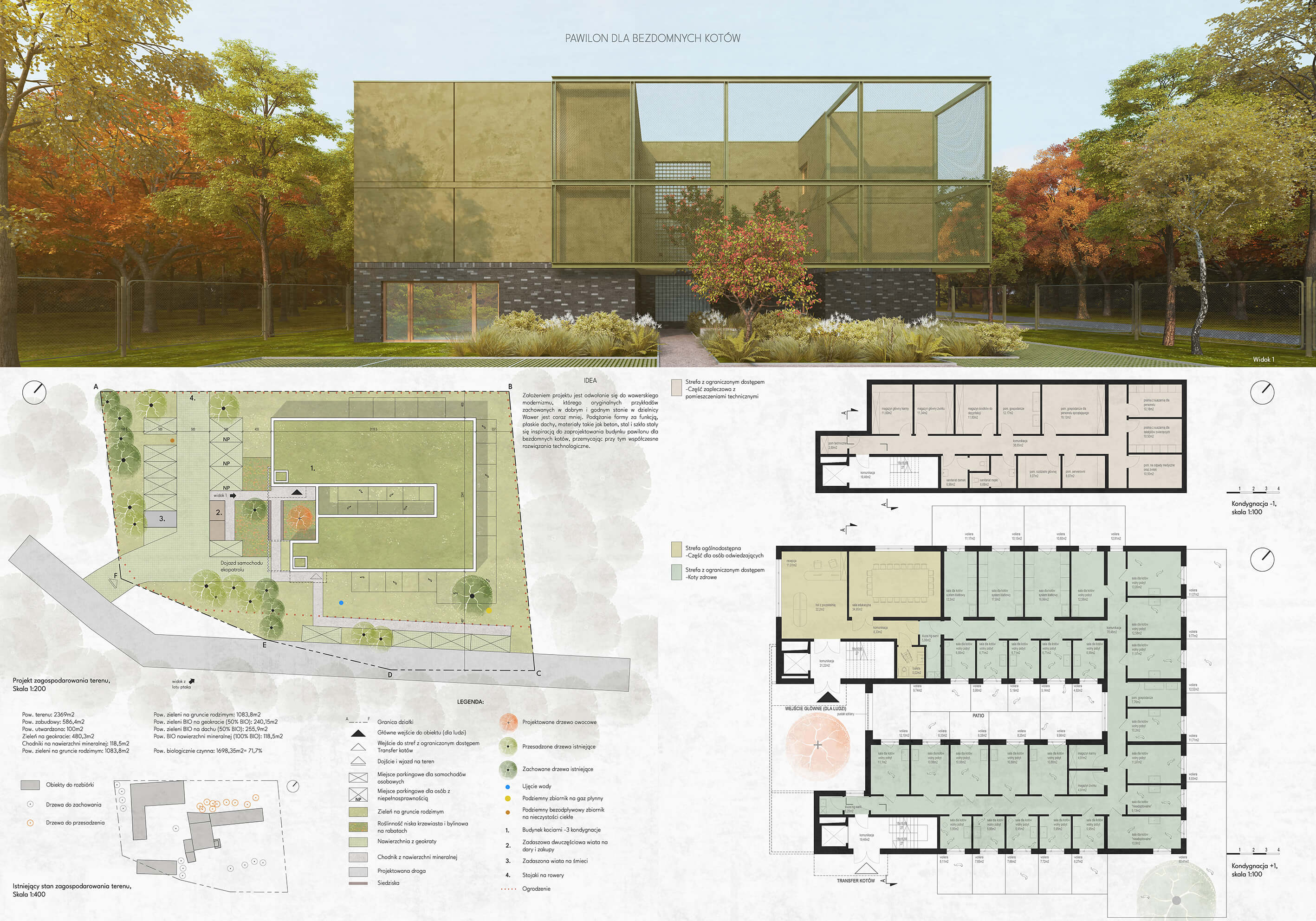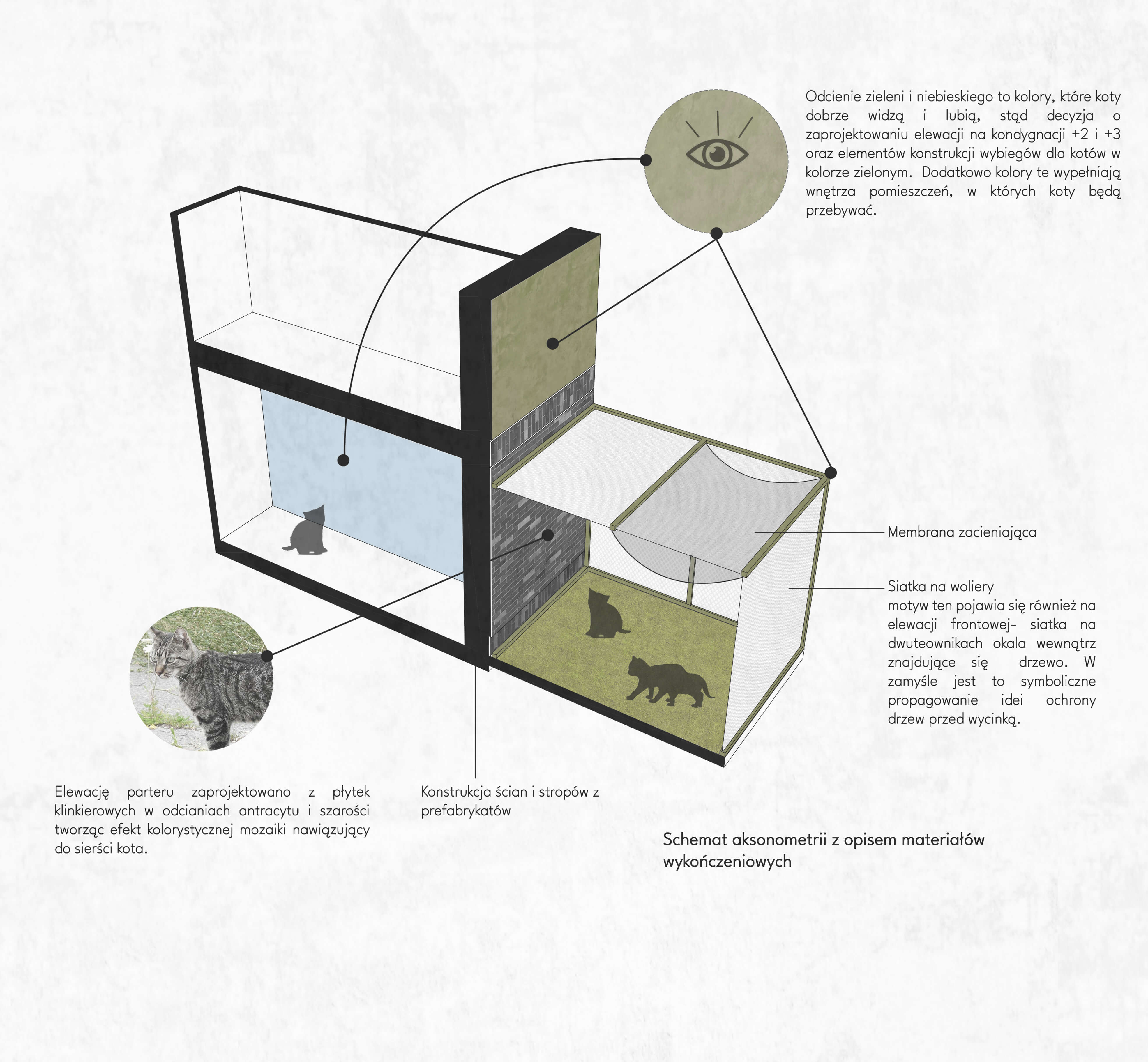 Założeniem projektu jest odwołanie się do wawerskiego modernizmu, którego oryginalnych przykładów zachowanych w dobrym i godnym stanie w dzielnicy Wawer jest coraz mniej. Podążanie formy za funkcją, płaskie dachy, materiały takie jak beton, stal i szkło stały się inspiracją do zaprojektowania budynku pawilonu dla bezdomnych kotów, przemycając przy tym współczesne rozwiązania technologiczne.