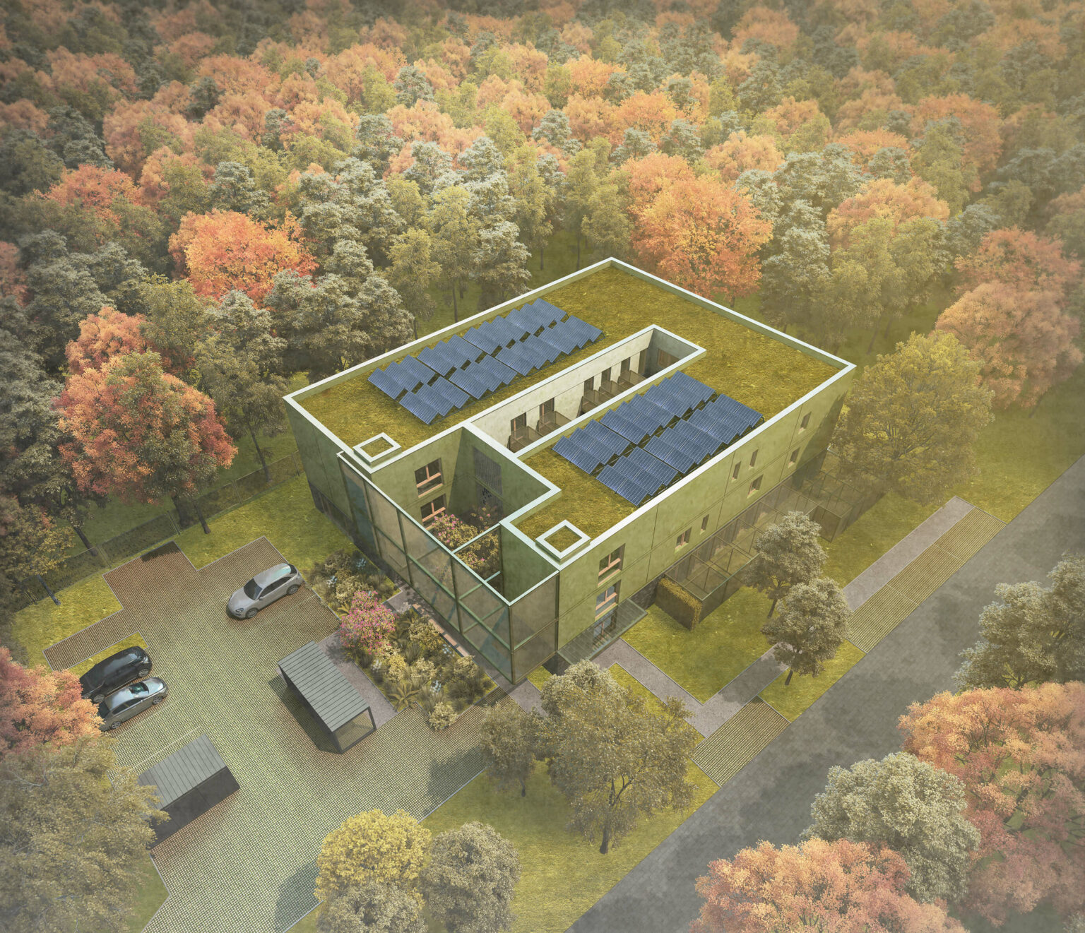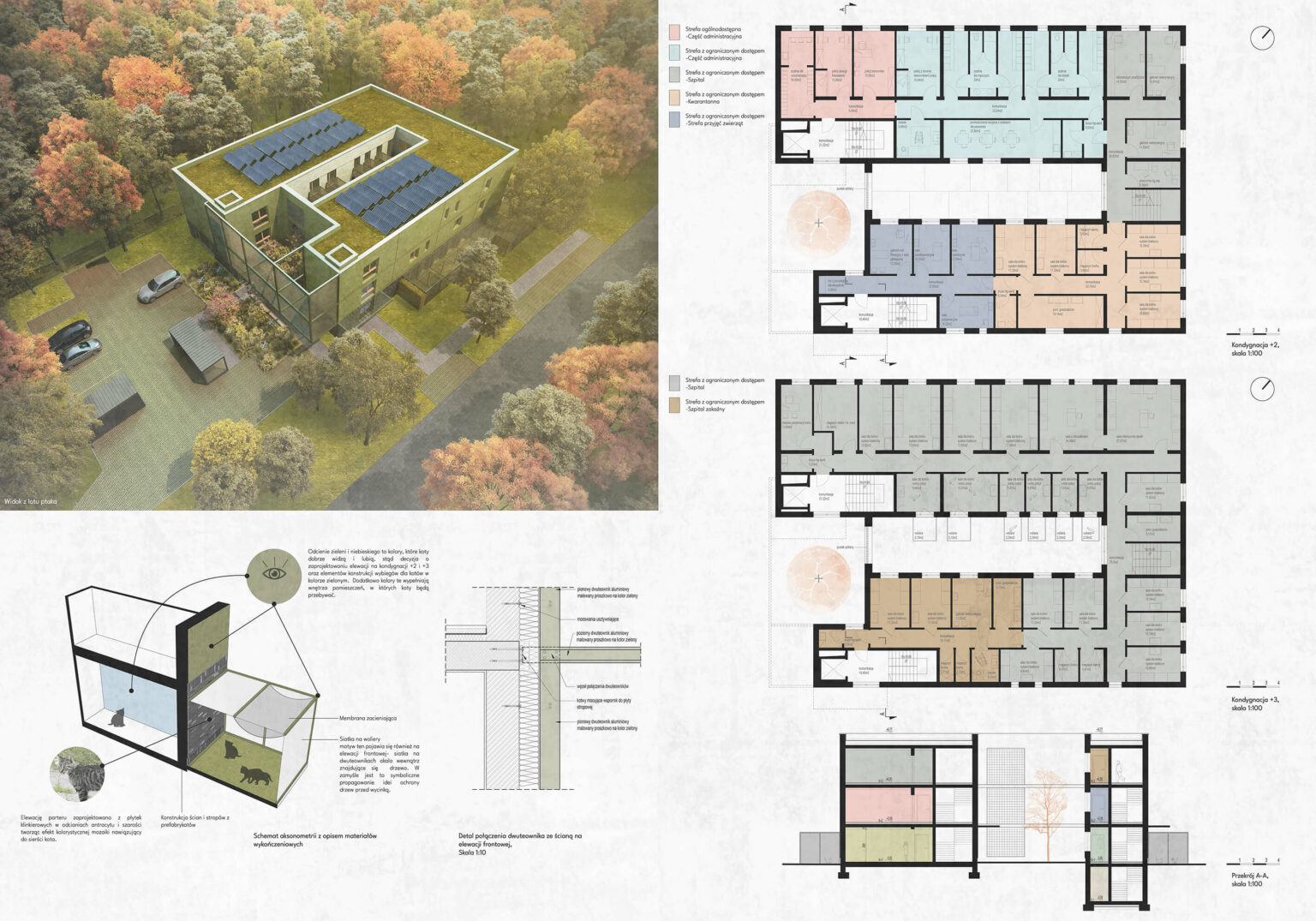 Budynek zaprojektowano jako 3 kondygnacyjny z częścią podziemną. Bryła w kształcie litery U z domknięciem w centralnej części tworzącym patio z wybiegiem dla kotów jest zwarta i stanowi odwzorowanie funkcji bryły.