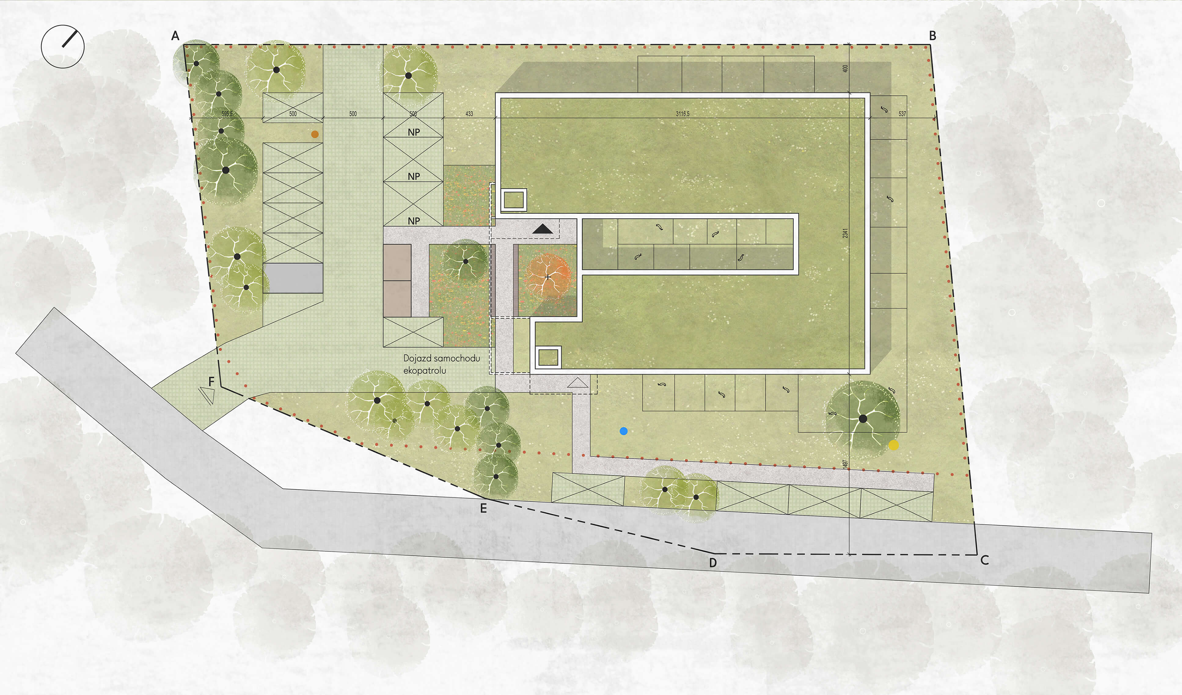 Przedpolem dla budynku jest strefa wejściowa z nasadzeniami na rabatkach, z zielenią niską charakterystyczną dla lasów wawerskich (np. storczyki, nasięźrzał pospolity, kukułka szerokolistna, trzcina ozdobna). W strefie wejścia głównego zaprojektowane zostało drzewo owocowe, zamknięte od strony frontowej siatką na konstrukcji dwuteowników- jest to symboliczny zabieg przestrzenny (instalacja) propagowania idei ochrony drzew przed wycinką.